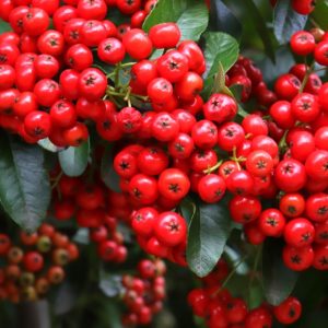 Lire la suite Pyracantha Arbuste persistant et vigoureux. Floraison mellifère blanche. Profusion de fruits jaunes, oranges ou rouges à l’automne.