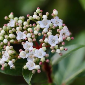 Lire la suite Viburnum tinus Le laurier tin est un des rares arbustes persistants à fleurir l’hiver. Fleurs blanches suivies de baies bleues.