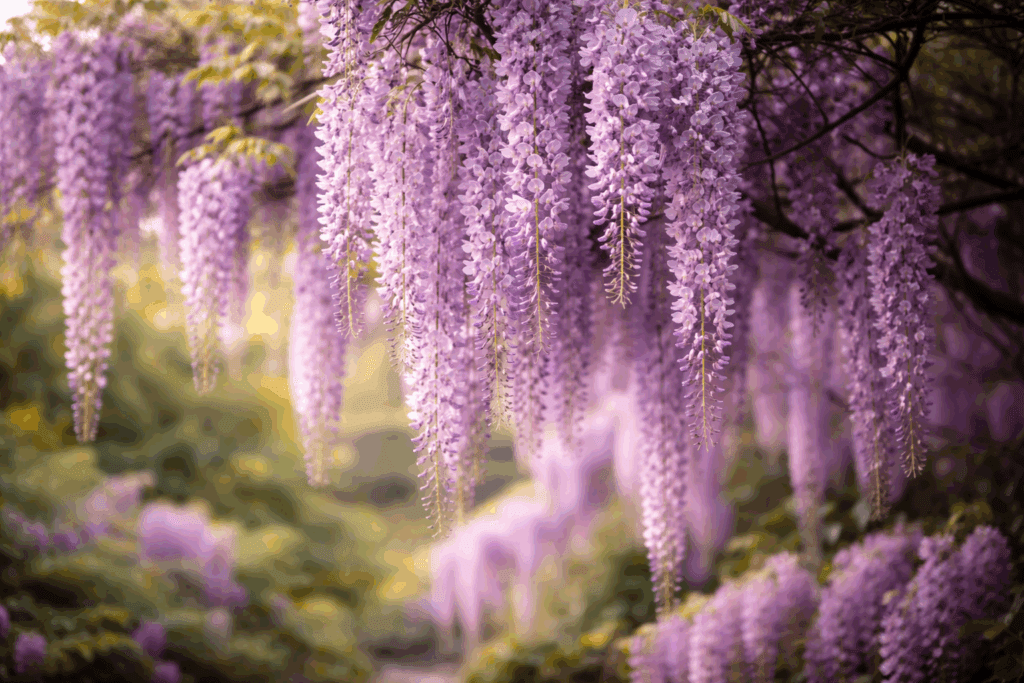 Les Glycines du Japon ont la particularité d’avoir de très grandes grappes de 30 à 60 cm, au léger parfum de miel.