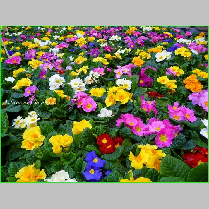 La primevère (Primula) riche en couleurs. Elles sont faciles à entretenir et spécialement cultivées pour pouvoir être plantées à l’extérieur dès que la température dépasse les 10 °C.