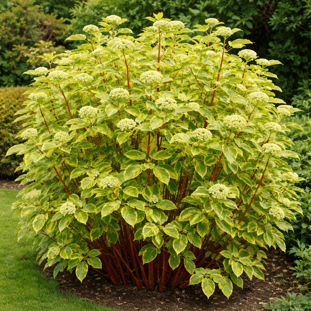 Le cornouiller blanc de Gouchault arbore un magnifique feuillage d’un vert clair éclatant largement marqué de jaune vif, avec des nuances de bronze sur les jeunes pousses.