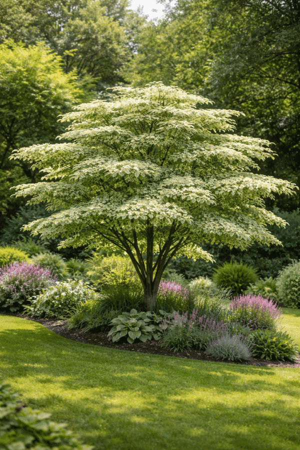 La silhouette élégante de ce petit arbre, avec ses branches horizontalement régulières, évoque les toits des pagodes orientales, ce qui lui a valu son nom. Ses larges feuilles lumineuses, magnifiquement ourlées de blanc, créent un effet visuel saisissant et extrêmement attrayant. À l’approche de l’automne, il revêt des teintes jaunes délicatement lavées de rose tendre. En mai, des bouquets légers de fleurs blanc crème, disposées en corymbes, éclosent au-dessus des plateaux de feuillage panaché.