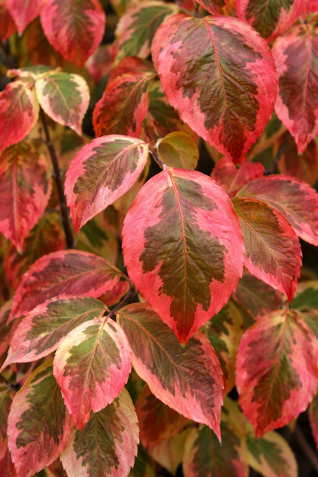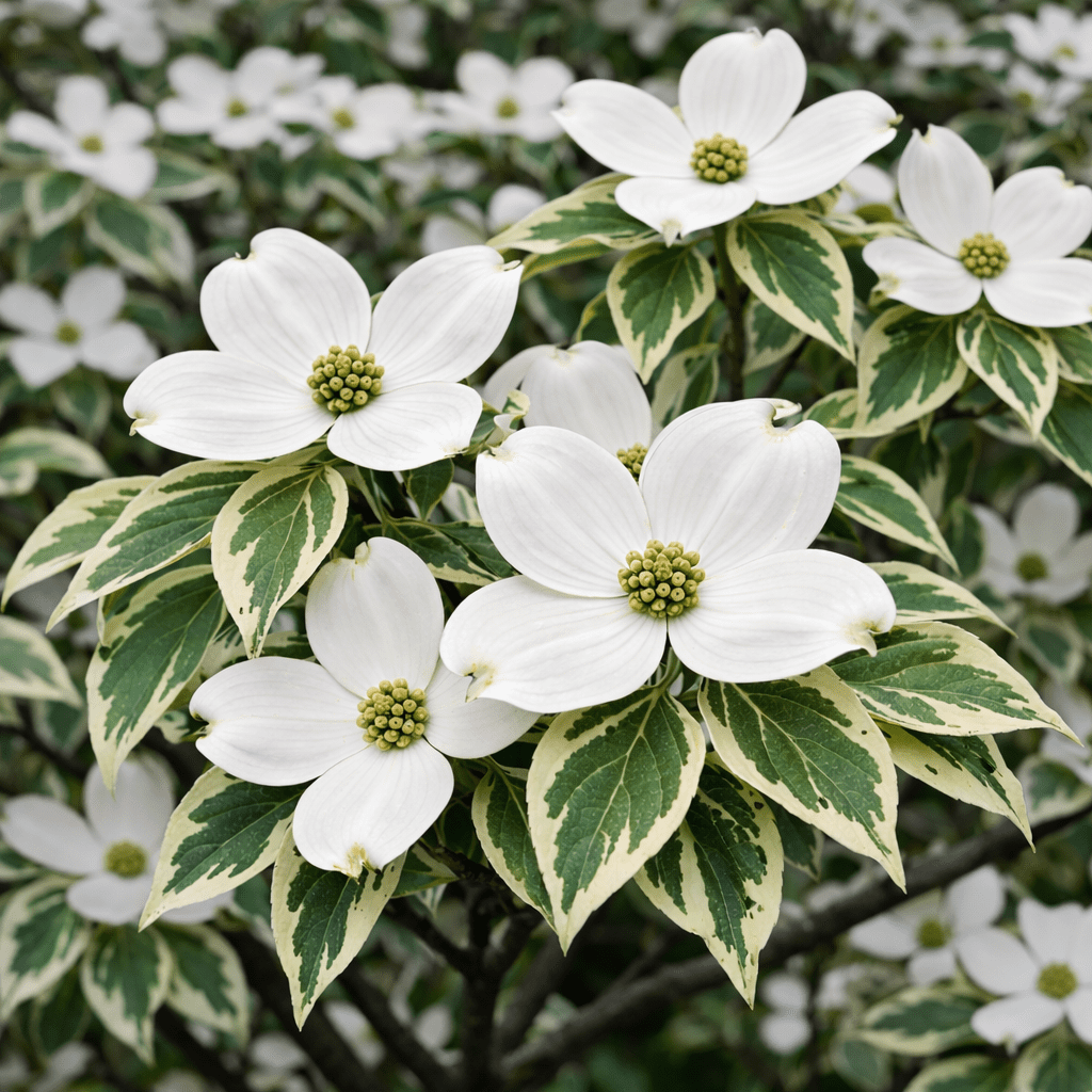 Le Cornouiller de Floride ‘Daybreak’ arbore un feuillage panaché aux teintes changeantes au fil des saisons. En période printanière et en début d’automne, il revêt un vert bleuté délicatement ourlé de blanc crème, se parant de nuances rosées sous l’éclat du soleil. L’été, il se pare de tons chatoyants, arborant un panaché de vert chartreuse. À l’approche de l’automne, les feuilles s’ourlent de rouge et de rose, pour finalement virer au rouge vif sous l’intensité solaire. Durant le mois d’avril-mai, l’arbuste se pare de nombreuses fleurs blanches, suivies de fruits rouges ovales et brillants, mesurant environ 1 cm de long. Dans sa jeunesse, il prend la forme d’un arbuste dressé à croissance lente, puis évolue pour devenir un petit arbre plus robuste. Idéal en massif ou en isolé, il prospère dans un sol légèrement acide à neutre, veillant à maintenir une humidité modérée (paillez le sol à son pied et arrosez si nécessaire). On le retrouve fréquemment dans les lisières et les sous-bois, d’où son affection pour une exposition à l’abri du plein soleil dans certaines régions.